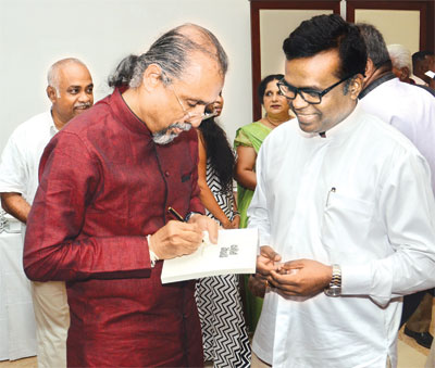 ජනමාධ්ය නියෝජ්ය අමාත්ය කරුණාරත්න පරණවිතාන මහතාගේ පිටපත සමන් විසින් අත්සන් කරන අයුරු